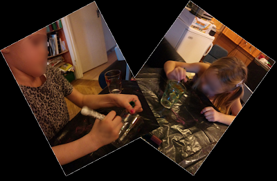 Min dotter är en riktig liten pysselmaja och därför kom förslaget om att vi skulle göra ett pysselkalas för henne nu när hon fyllde sju år. Det enda negativa med detta var att hon endast kunde bjuda in tio kompisar vilket kan vara svårt för en mycket social liten flicka. Även tio kan vara mastigt, men vi klarade oss igenom det. En viktig information som stod på inbjudningskortet var "Klädsel, oöm, det kan förekomma en hel del färg"